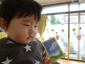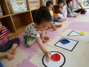今日は形がたくさん。丸・三角・四角も集めカードに乗せてみました。